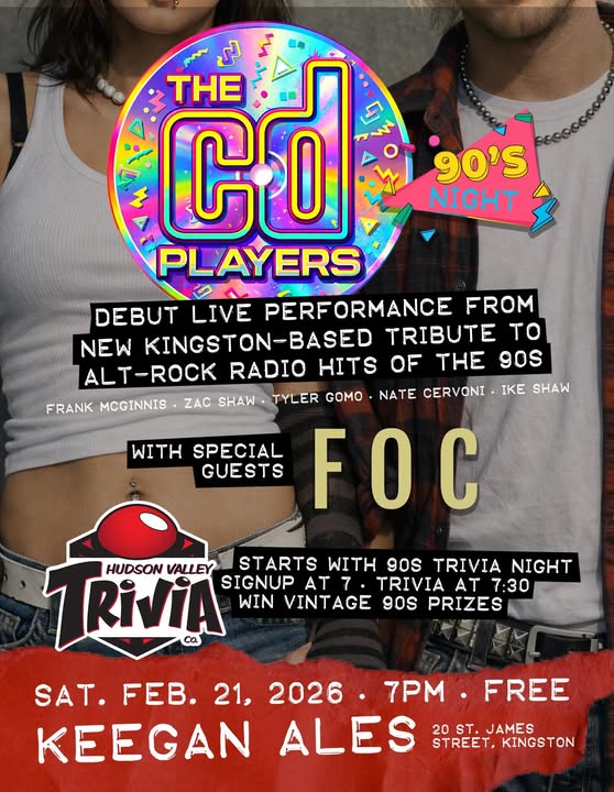 It’s the debut show at Keegan Ales for The Cd Player’s, a 90s alt-rock radio hit band! Joined by the amazing Foc Band & 90s trivia night with Hudson Valley Trivia Co!